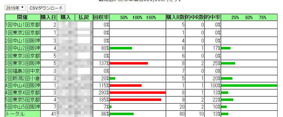 金額はぼかし、的中率 13% 回収率 86%。例年より的中率は上で回収率が下。クリーンヒットはこのときの新潟だけ。